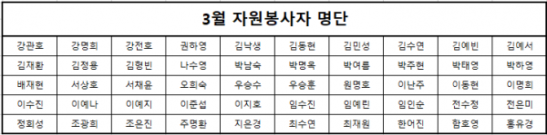 목록 2021년 3월 자원봉사자 명단 페이지 정보 장재석 조회 1,457 입력 2021-04-01 11:18 댓글 0 본문 3월에는 각 팀마다 많은 프로그램들이 개강하면서 자원봉사를 위하여 찾아주시는 분들이 많아지셨습니다.코로나19상황임에도 자원봉사 활동을 위하여 복지관에 방문해주신 분들께 감사드립니다. -자원봉사활동은 정부의 방역지침을 준수하며 진행되었습니다. 목록 이전글2021년 4월 자원봉사자 명단 2021.05.03 다음글2021년 2월 자원봉사자 명단 2021.02.26 댓글 0 댓글목록 등록된 댓글이 없습니다.