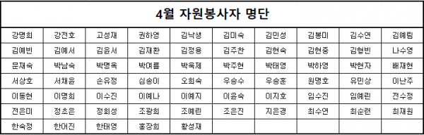 목록 2021년 4월 자원봉사자 명단 페이지 정보 장재석 조회 1,295 입력 2021-05-03 14:39 댓글 0 본문 코로나19상황임에도 자원봉사 활동을 위하여 복지관에 방문해주신 분들께 감사드립니다. -자원봉사활동은 정부의 방역지침을 준수하며 진행되었습니다. 목록 이전글2021년 5월 자원봉사자 명단 2021.06.01 다음글2021년 3월 자원봉사자 명단 2021.04.01 댓글 0 댓글목록 등록된 댓글이 없습니다.
