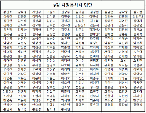목록 9월 도움의 손길 페이지 정보 이동혁 조회 1,597 입력 2019-10-08 13:33 댓글 0 본문 9월 한달간 봉사에 참여하고 힘써주신 분들께 다시 한번 감사의 말씀을 드립니다^^위 명단에 이름이 누락되어 있는 분은 070-4838-1723으로 연락부탁드립니다. 목록 이전글10월 도움의 손길 2019.11.06 다음글51사단 2506부대 봉사활동 진행(9/18) 2019.09.19 댓글 0 댓글목록 등록된 댓글이 없습니다.