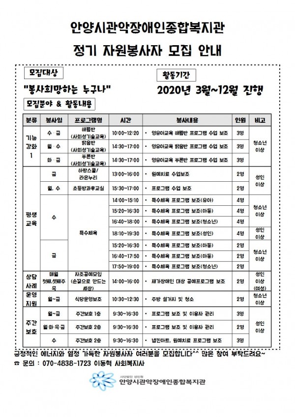 2020년 안양시관악장애인종합복지관 정기자원봉사자 모집 안내
