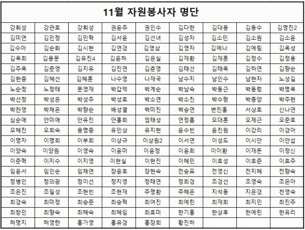목록 11월 도움의 손길 페이지 정보 이동혁 조회 1,393 입력 2018-12-11 09:51 댓글 0 본문 11월 한달간 봉사에 참여하고 힘써주신 분들께 감사의 말씀을 드립니다^^위 명단에 이름이 누락되어 있는 분은 070-4838-1723으로 연락주세요 감사합니다. 목록 이전글51사단 2506부대 봉사활동 진행(12/12) 2018.12.13 다음글10월 도움의 손길 2018.11.14 댓글 0 댓글목록 등록된 댓글이 없습니다.