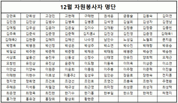 목록 12월 도움의 손길 페이지 정보 이동혁 조회 1,397 입력 2019-01-07 11:00 댓글 0 본문 12월 한달간 봉사에 참여하고 힘써주신 분들께 감사의 말씀을 드립니다^^위 명단에 이름이 누락되어 있는 분은 070-4838-1723으로 연락주세요 감사합니다. 목록 이전글GS 리테일 단체 봉사활동 진행 2019.01.24 다음글51사단 2506부대 봉사활동 진행(12/12) 2018.12.13 댓글 0 댓글목록 등록된 댓글이 없습니다.