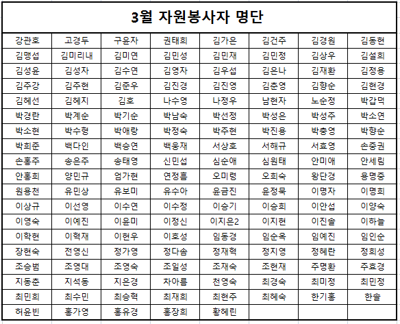 목록 2019년 3월 도움의 손길 페이지 정보 이동혁 조회 1,461 입력 2019-04-13 14:20 댓글 0 본문 3월 한달간 봉사에 참여하고 힘써주신 분들께 감사의 말씀을 드립니다^^위 명단에 이름이 누락되어 있는 분은 070-4838-1723으로 연락주세요 감사합니다. 목록 이전글51사단 2506부대 봉사활동 진행(4/17) 2019.04.23 다음글국가인재개발원 단체 봉사활동 진행 2019.03.21 댓글 0 댓글목록 등록된 댓글이 없습니다.