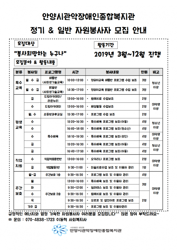 - 안양시관악장애인종합복지관_정기자원봉사자_모집_안내문.pdf (54.7K) 120회 다운로드DATE : 2019-07-15 15:19:27
