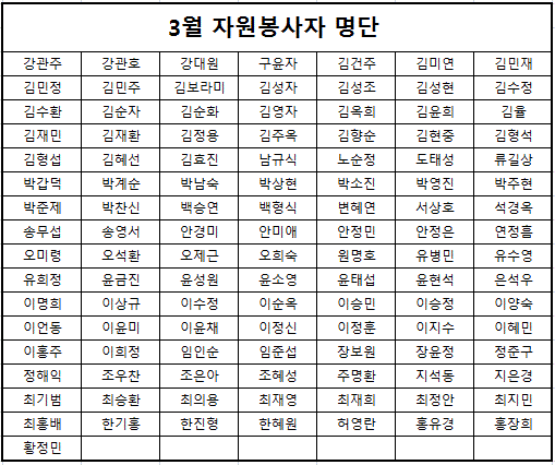 목록 3월 도움의 손길 페이지 정보 이동혁 조회 1,495 입력 2018-04-25 14:09 댓글 0 본문 3월 한달간 봉사에 참여하고 힘써주신 분들께 감사의 말씀을 드립니다^^위 명단에 이름이 누락되어 있는 분은 070-4838-1723으로 연락주세요 감사합니다. 목록 이전글4월 도움의 손길 2018.05.09 다음글2월 도움의 손길 2018.03.06 댓글 0 댓글목록 등록된 댓글이 없습니다.