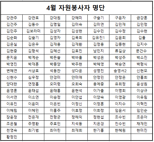 목록 4월 도움의 손길 페이지 정보 이동혁 조회 1,507 입력 2018-05-09 17:19 댓글 0 본문 4월 한달간 봉사에 참여하고 힘써주신 분들께 감사의 말씀을 드립니다^^위 명단에 이름이 누락되어 있는 분은 070-4838-1723으로 연락주세요 감사합니다. 목록 이전글5월 도움의 손길 2018.06.05 다음글3월 도움의 손길 2018.04.25 댓글 0 댓글목록 등록된 댓글이 없습니다.