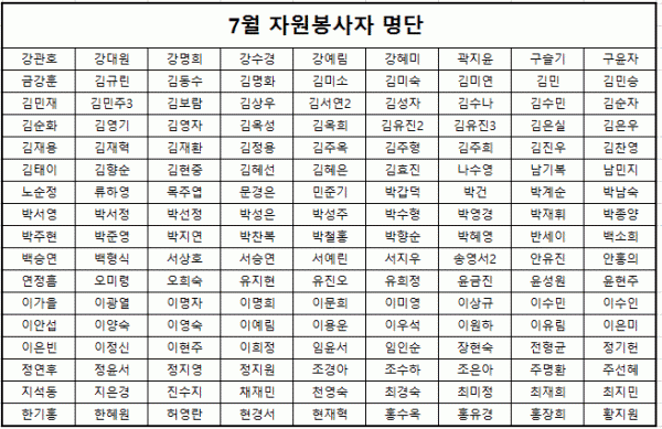 목록 7월 도움의 손길 페이지 정보 이동혁 조회 1,523 입력 2018-08-20 16:32 댓글 0 본문 7월 한달간 봉사에 참여하고 힘써주신 분들께 감사의 말씀을 드립니다^^위 명단에 이름이 누락되어 있는 분은 070-4838-1723으로 연락주세요 감사합니다. 목록 이전글51사단 자원봉사자 2018.08.23 다음글6월 도움의 손길 2018.07.19 댓글 0 댓글목록 등록된 댓글이 없습니다.