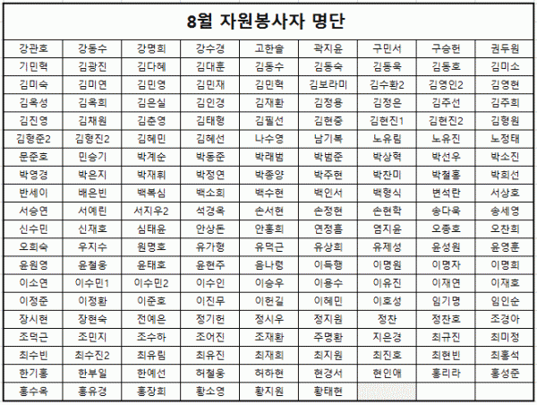 목록 8월 도움의 손길 페이지 정보 이동혁 조회 1,501 입력 2018-09-07 14:42 댓글 0 본문 8월 한달간 봉사에 참여하고 힘써주신 분들께 감사의 말씀을 드립니다^^위 명단에 이름이 누락되어 있는 분은 070-4838-1723으로 연락주세요 감사합니다. 목록 이전글51사단, 기아자동차 봉사자 방문 2018.09.21 다음글51사단 자원봉사자 2018.08.23 댓글 0 댓글목록 등록된 댓글이 없습니다.