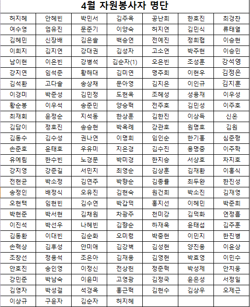 목록 4월 도움의 손길 페이지 정보 안희정 조회 1,591 입력 2017-06-01 09:36 댓글 0 본문 4월 한달간 봉사에 참여하고 힘써주신 분들께 감사의 말씀을 드립니다. 위 명단에 이름이 누락되어 있는 분은 070-4838-1723으로 연락주세요 감사합니다. 목록 이전글5월 도움의 손길 2017.06.01 다음글3월 도움의 손길 2017.04.10 댓글 0 댓글목록 등록된 댓글이 없습니다.