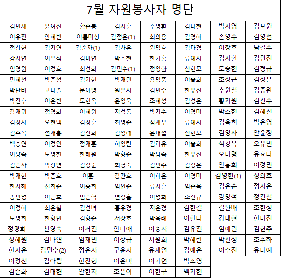 목록 7월 도움의 손길 페이지 정보 안희정 조회 1,606 입력 2017-08-30 14:20 댓글 0 본문 7월 한달간 봉사에 참여하고 힘써주신 분들께 감사의 말씀을 드립니다. 위 명단에 이름이 누락되어 있는 분은 070-4838-1723으로 연락주세요 감사합니다 목록 이전글51사단 자원봉사자 2017.09.05 다음글51사단 박주현 원사 본 기관 마지막 자원봉사를 끝으로. 2017.08.07 댓글 0 댓글목록 등록된 댓글이 없습니다.