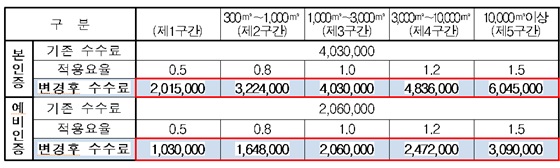 각 구간별 수수료는 ▲제1구간(300㎡미만): 본인증 201만5000원, 예비인증 103만원 ▲제2구간(300㎡〜1,000㎡): 322만4000원, 예비인증 164만8000원 ▲제3구간(1,000㎡〜3,000㎡): 본인증 403만원, 예비인증 206만원 ▲제4구간(3,000㎡〜10,000㎡): 본인증 483만원, 예비인증 247만2000원 ▲제5구간(10,000㎡이상): 본인증 604만5000원, 예비인증 309만원이다.