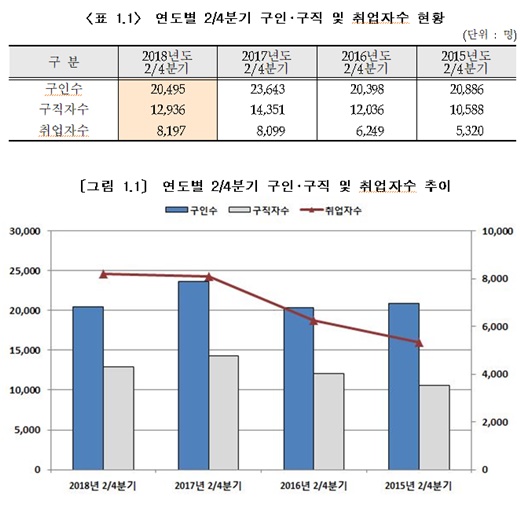 구인수는 2만495명으로 전년 동분기 대비 13.3% 감소했고, 구직자수도 1만2936명으로 전년 동분기 대비 9.9% 감소했다. 취업자수는 8197명으로 전년 동분기 대비 1.2% 증가했다.