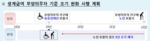그러나 최근 저소득층 소득수준 악화 상황, 특히 노인층의 소득수준이 지속적으로 열악하다는 점을 감안해 생계급여 부양의무자 기준 폐지 로드맵을 앞당기기로 했다.