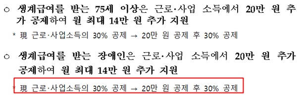 이에 따라 비수급빈곤층 약 7만 명이 신규로 생계급여 지원을 받을 수 있게 될 것으로 전망된다. 이와 함께 일하는 노인(75세 이상)과 장애인에 대해서는 가구 소득산정 시 근로소득 공제도 확대한다.