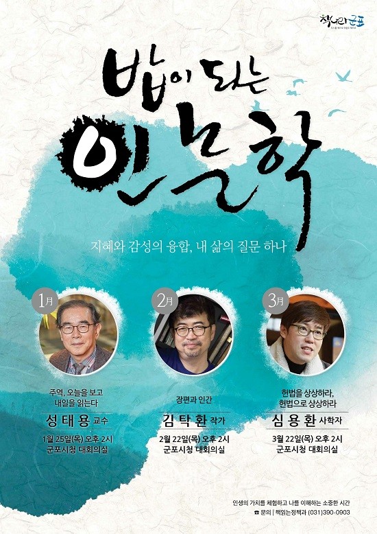 군포시는 매월 문학. 역사. 철학. 예술 등 다양한 분야의 유명한 명사들을 초빙해 시민들의 인문학적 소양을 고취시키는 군포시의 독서진흥사업으로 오늘 3월까지 매달 성태용 교수, 김탁환 작가, 심용환 사학자가 강사로 나선다고 말했다.