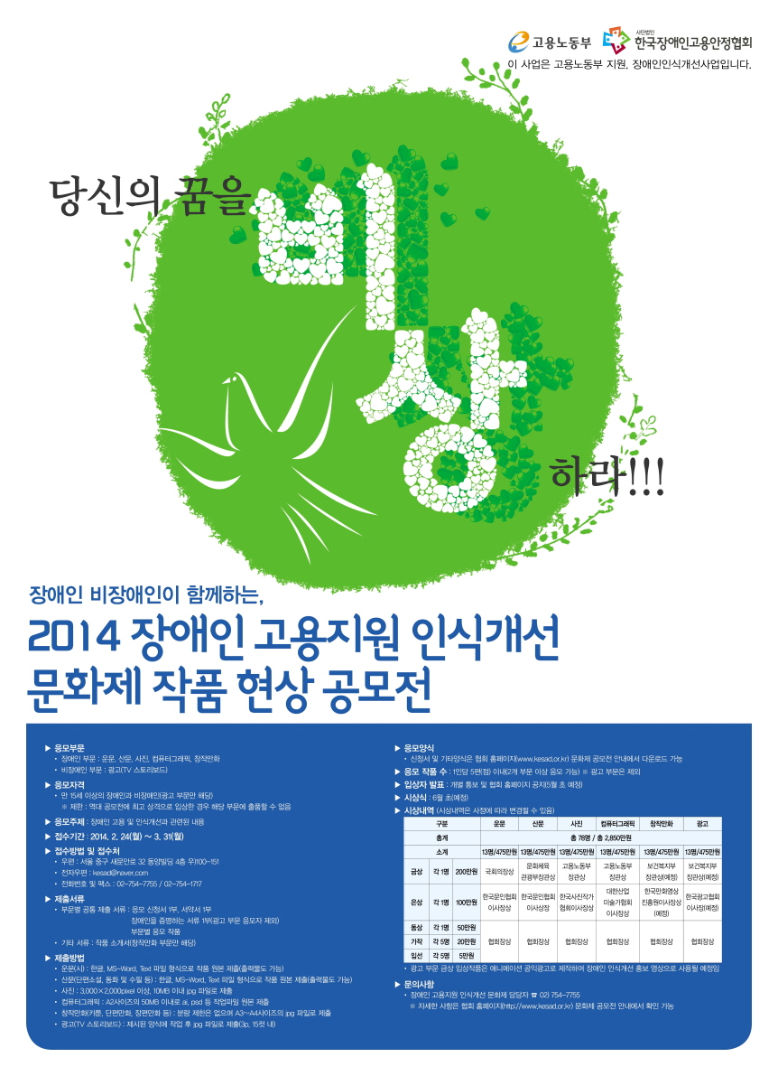 (사)한국장애인고용안정협회(회장 조향현· 이하 장고협)는 고용노동부 장애인 인식개선 지원사업으로 진행되는 ‘2014 장애인 고용지원 인식개선 문화제’의 부문별 작품을 2월24일부터 3월31일까지 공모한다.